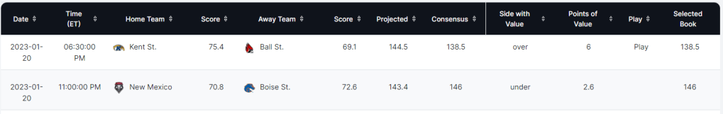 Boise State/New Mexico u146 : Best Bet of the night! One of my favorite totals of the season. I think tonight will be a masterclass from Leon Rice. He will want this pace to be a crawl. The Broncos come into this game ranked 246th in pace, and know that a half-court game will be crucial for their chances of upsetting the Lobos at The Pit. On the surface level, everyone sees New Mexico as this very high scoring team that is having a fantastic season. However, a lot of this scoring is in transition from baiting an up & down game with inferior opponents. The Lobos are actually one of the worst jump shooting teams in the country in the half-court. New Mexico ranks 324th in three pointers made per game at only 5.7. This is a Boise State defense that packs the interior and loves forcing their opponents into tough mid-range jumpers and three pointers. I think this is a crucial edge for our total. Also, these defenses just rock. Boise State is 12th in the country in defensive efficiency this year. That is elite. New Mexico’s defense isn’t too shabby either. 52nd in the country in defensive efficiency. Shot Quality does not have as much conviction as me on this under, but that is the play their model suggests as a 143 point total. Below is a preview of their Value Finder (free gift of Kent St/Ball St – I’m a man of the people). Use promo code – SNIPER – for 30% off of all membership packages. The Shot Quality guys have great stuff. Very useful when handicapping. I have this at 137. 9 points of perceived value. Big time play for me. Let’s bring this one home!