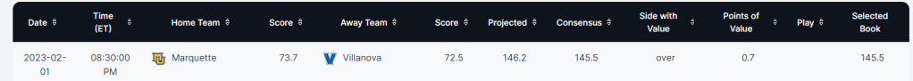 Villanova/Marquette o145 : Marquette is an absolute fireball at Fiserv. They are averaging 82.4 ppg at home in conference play. They should get near that number again tonight against a Villanova team ranking 225th in defensive efficiency this season. Nova has added Justin Moore back into the equation after a long recovery process on his knee. I think that is great for their offensive outlook, but he will struggle to stay in front of the athletic Golden Eagles tonight defensively. He just doesn’t have that closing speed yet. This should make the Wildcats’ defensive efficiency suffer even more. Also, I love picking spots where Vegas virtually doesn’t change the total (144.5 last matchup) even when the result of the previous match does not come close to that number. The first matchup between these two ended on 134 points. However, the game was 66-66 with 3:42 left and it ended 68-66 in Marquette’s favor. As you know, that is an anomaly type of ending for that score-line with 4 to go. Also, what I loved from that game was the volume of three pointers that we saw. There were 59 three pointers attempted between the two. I think we could see a similar number tonight. Marquette will up this pace. There will be nothing Nova can do to stop it if they want to hang around. I think we get to at least 150 here. This bet is Shot Quality approved. Check out their Value Finder below: