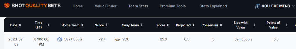 Saint Louis -2.5 : I love the Billikens in this home spot. Saint Louis is 7-2 and 0.5 game back from VCU for the A-10 lead. The impressive part is that they have gotten themselves in this position the hard way. Saint Louis has played 6 of their first 9 A-10 games on the road. They are 3-0 at home in conference play, and will take the A-10 lead after getting a W in Chaifetz Arena tonight. VCU wins games by forcing a heavy volume of turnovers from their opponents. However, Saint Louis has one of the best point guards in the country. Yuri Collins is leading the nation with 10.1 assists per game, and is only turning the ball over 3.3 times per game. Having him as a floor general against the Rams pressure will be vital to success. Saint Louis built out a 21 point lead in this matchup last year before VCU hit a bunch of threes at the end of the game to make it look closer than it was. This is a great matchup for Saint Louis, and they get a big win tonight. In Yuri We Trust. This matchup is Shot Quality approved. Here is a snapshot of their Value Finder for this game: