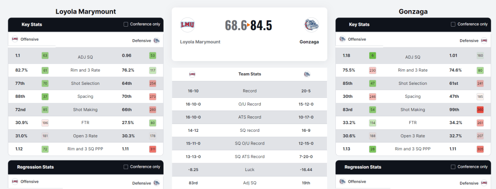 Gonzaga -7.5 : Best Bet! Revenge is a dish best served cold. Gonzaga is going to be very mean to our LMU Lions tonight. Marymount snapped Gonzaga’s 75 game home winning streak at the Kennel a few weeks ago. However, there is a glaring stat that has convinced me that it was indeed a fluky performance. The Zags are 3rd in the country in points from 2 pointers. A lot of this is Timme, but the Gonzaga backcourt finds the majority of their success driving to the rim. LMU is 314th in the country in opponent percentage of points from 2’s. It is going to be a field day inside the arc for the pissed off Zags. Mark Few made some coaching mistakes in guarding Cam Shelton in the first matchup, but that won’t happen again. You are not going to burn Mark Few twice in a row with one player. There is also incentive here for Gonzaga to hang a large number on LMU. They are only one game back from SMC for the co-lead in the WCC. The tie-breaker for the WCC title goes to the NET rating. The Gaels are currently 6th in the NET, and Gonzaga ranks 12. LMU is currently 82nd in the RPI right now. This would be a firm Quad 2 win, with an outside chance of potentially becoming a Quad 1. It would certainly help the NET of the Zags to blowout LMU. Trusting them to do so. This bet is Shot Quality approved. See below for a preview of their Matchup Breakdown: