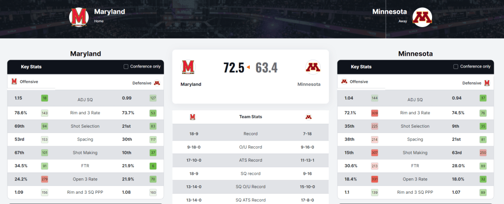 Minnesota +15.5 & o129.5 : The Best Bet tonight is the over in this matchup. I also love the Gophers getting 15.5 points as well. We very rarely have had a double up in a game this season, but I am feeling an edge on both sides here. Dawson Garcia’s return from injury has been exactly what Minnesota has been hoping for all season long in regards to his play. The Savage, MN native scored 23 in his first game back against Penn State, and then added 18 points last time out against Illinois. Both of these games finished as single digit contests. The Gophers were getting ran out of the gym in his absence, so he was instantly a difference maker. His presence is felt mostly on the offensive end. Minnesota scored 69 points in each of these last two games. Those were the first times the Gophers had scored that many points since January 12th. The attention that he is getting is opening up the offensive game of Jamison Battle as well. If you remember from last season, Battle quite literally carried this team to some Big 10 wins. He has the freedom to do that again now that he has a capable offensive threat on the court with him at the same time. Battle scored a season high 31 points in Monday’s loss to Illinois. Maryland absolutely embarrassed Minnesota without Garcia on February 4th. An 81-46 final. So, we have a nice revenge angle here as well. While I believe Maryland will still be able to pretty much score at will, I think the Gophers will be able to keep up enough with Garcia in the lineup to cover both of these numbers for us. This matchup is also heavily Shot Quality approved. Here is a preview of their Matchup Breakdown:
