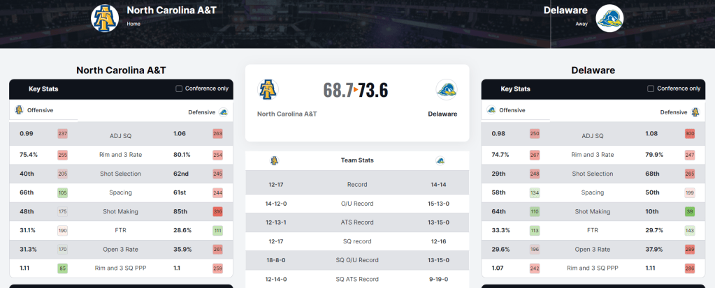Delaware/NC A&T u149.5 : Bad number here, but I thought we were jumping in at the peak of the rise. This opened at 146. I even thought the opener was a tad high. I am assuming the push in the market is from recent final scores of these teams, but the pace in this game just is not conducive for a number this high. Delaware is ranked 225th in the country in possessions per game. NC A&T plays faster than Delaware, but they are only ranked 112th. This game is being played in Greensboro, and the under is 5-3 in CAA home games for the Aggies. These teams are just horrific from an offensive efficiency standpoint as well. The Blue Hens are ranked 188th, and the Aggies are ranked 302nd. There would need to be an outstanding outlier of pace and offensive efficiency for this game to go over, so I am trusting the data. The Shot Quality model also approves this under. Here is a preview of their Matchup Breakdown: