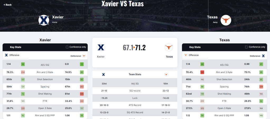 Xavier/Texas 1H u70 : Texas’ 1H defense has been ELITE in this 6 game winning streak. Here are their past 6 defensive performances in the 1H: Kansas 24 points, Oklahoma State 26 points, TCU 26 points, Kansas 33 points, Colgate 32 points, Penn State 23 points. That is a 27.3 point average for their opponents in the 1H on this hot streak. Outside of Boum, I think Xavier may have a hard time getting out to a hot start. Nunge is going to have a lot of problems with the depth of the Texas frontcourt, and Carr & Rice can put the clamps on Kunkel and Claude. The Texas defense does trend down after halftime, so I am not as confident in a full game play. We will get under the number in the 1H of this one and get out of there. If you are looking for a full game lean, Shot Quality supports a full game under. Here is a preview of their Matchup Breakdown. Use promo code “SNIPER” for 30% off of all membership packages at shotqualitybets.com