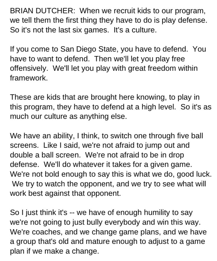 San Diego State +7.5 : Brian Dutcher has been very deliberate about what the Aztecs’ plan is going to be tonight. This was a quote from his pre-game presser – “If we can turn it into a half court game — and this goes for any game, Mountain West games — I like our chances.” He has no interest in running up and down with Bama in this game. He knows that his offense is built to perform well in the halfcourt, and that his defense has a better chance of finding success if Alabama is not in transition and running downhill. This Aztec defense is elite. They are 15th in the country in defensive efficiency, and have tightened the screws even more recently. They have the #1 defensive efficiency in the tournament to this point. Say what you will about the seed lines that they have faced, but CofC and Furman have elite offenses. Charleston ended their season 21st in the country in offensive efficiency, and Furman finished 6th. Comparatively, Alabama ranks 34th. Now, I am not saying that CofC or Furman pose a bigger threat than Alabama .. but, I will say that this defense has the ability to make life tough for the Tide. Defensive intensity is in the DNA of SDSU. Below is a quote from Dutcher on how he views defense. I believe that SDSU will slow the pace & perform well enough on the defensive end to get us within the number here. This bet is also Shot Quality approved. See below for a preview of their Matchup Breakdown:
