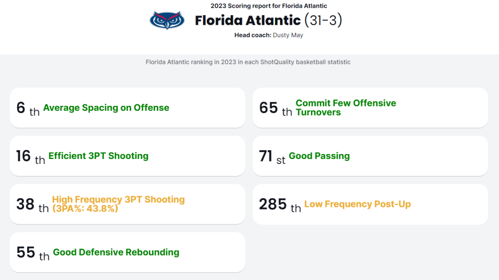 FAU +2 : This is my Best Bet. Florida Atlantic is going to the Final Four. The haters are going to be furious, but the college basketball enthusiasts know how great this team is. There are a copious amount of tickets on Kansas State because people “want” Markquis Nowell to make a Final Four (I do too). The Wildcats are a super public play today. I am seeing 71% of tickets are currently on K-State. However, FAU is built to defend this Nowell playmaking style of offense. Florida Atlantic is 4th in the country in opponent assists per game. They only allow 8.2 per contest. The Owls are equipped to defend off-ball against the Wildcats when Nowell is trying to find cutters. Nowell was able to find this success consistently in their Sweet 16 game, but that is because Michigan State is horrific in defending off-ball and allowing opponent assists. The Spartans rank 203rd in that category. FAU should also find some success on the glass here. Kansas State continues to get obliterated in that metric this tournament. Meanwhile, the Owls are coming off of a game where they went toe-to-toe with Tennessee on the glass. I will share the main Shot Quality page again for FAU below. They have a stat profile that is built for tournament play. I believe that they will shock the world and head to Houston for the Final Four.
