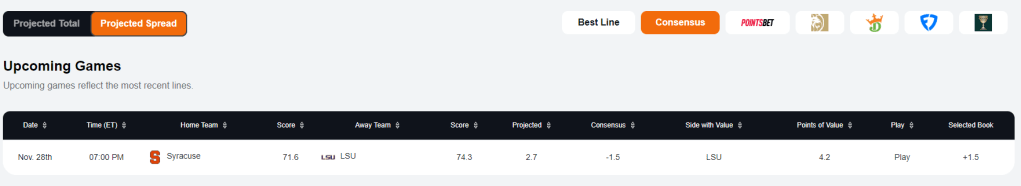 LSU +1.5 : The Tigers are going to win this game in the paint. Syracuse is struggling on the boards to start the year. That may be an understatement.