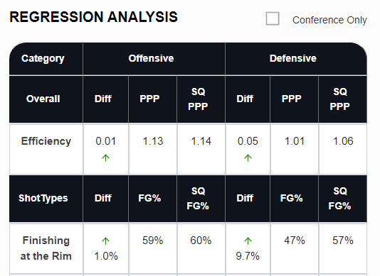 This is a fantastic matchup for Malevy Leons and Darius Hannah. Duquesne will not be able to cope with their efficiency in the post. The Shot Quality regression analysis is pointing to big nights ahead for the Dukes’ opponents around the rim: