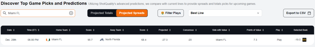 The Ospreys have been susceptible to letting up big, big numbers from power conference opponents this season. UNF allowed 103 points to Iowa and 91 points to Florida State earlier in the year. They have also gotten scorched by a few low-major opponents as well. Miami will get whatever they want tonight and this will be a blowout from jump street. This is one of the bigger SQ Model edges of the night. Below is a preview of the Value Finder tool on Shot Quality Bets. Use promo code “TPS” for a discount on your first month when you sign up!