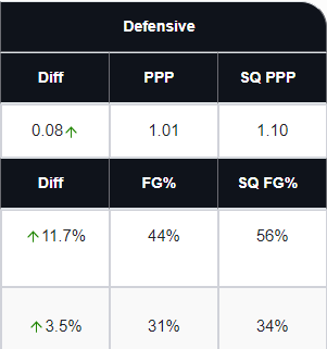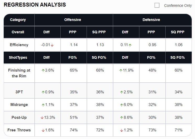 I believe that we have a very strong chance to make double digit three pointers tonight. That will go a long way towards scoring 64 points. Texas’ defense is due for regression across the board. Here is their Shot Quality regression analysis:
