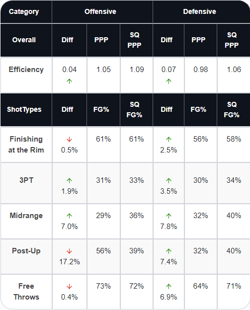 If you have been following me this season, you know that I have been high on this Panther team since the start of the season. Shot Quality metrics are showing that I was not wrong in my assumptions. Pitt ranks 28th in the SQ adjusted offensive rating and 33rd in the defensive rating. There are very few teams that have both units rated this highly. Pitt’s SQ PPP on offense is 1.17 and their defense is 0.99. In comparison, UNC is 1.19 on offense and 1.02 on defense. Not much of a disparity there in the PPP categories. That gives me even more reason to believe Pitt has a real chance at an upset here.