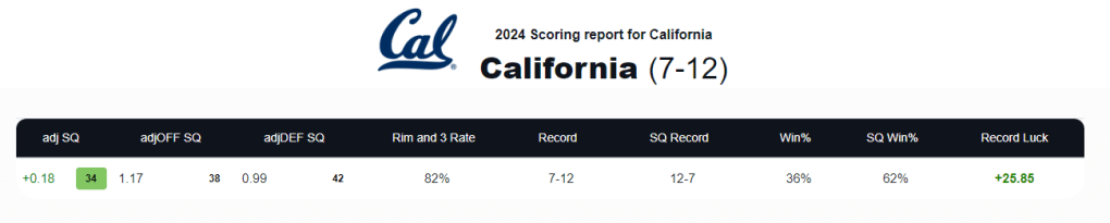 Cal is 34th (!!!) in the Shot Quality adjusted overall rating. Yes, the Cal Bears. Mark Madsen is a phenomenal coach and he finally has the health to have this team firing on all cylinders. Not many teams can claim a Top 40 offense and defense in the adjusted SQ rating. Shot Quality expects Cal to be at 12-7 this season even with the injuries that they have endured. This is not a team you want to catch right now in conference play.