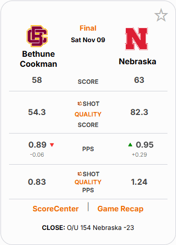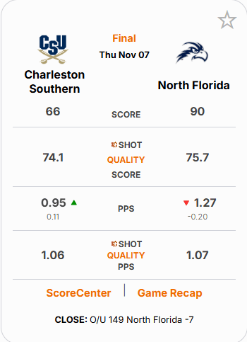 Bethune Cookman’s defense is bad. Really bad. I expect a big night from the Mastodon offense, and that is why I think they can cover this hefty number. The Wildcats had a very nice result last time out. I could not believe the score when I was checking the box scores. Thankfully, Shot Quality provided us with the data to show that it was a lot of smoke and mirrors.