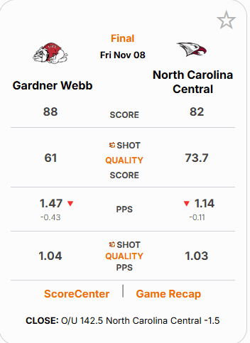 We bet on NCCU in their most recent outing. Gardner Webb shot over 70% for the entire game. I am not even remotely joking. Could the Eagles defense have been better? Yes. Did they receive some of the worst defensive shot luck that we will see this season? Also, yes.