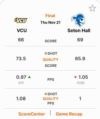 Vanderbilt -4.5 : We have been in the driver’s seat of the Commodore bandwagon since the beginning of the season. This team is so legit. It has been great taking advantage of the early season market due to one of the biggest blemishes in the KenPom ratings that we have out there right now. Seton Hall is the worst team in this Charleston Classic. They made some insane shots in the 2H against VCU to complete their comeback. The Shot Quality score is more indicative of how that game went.