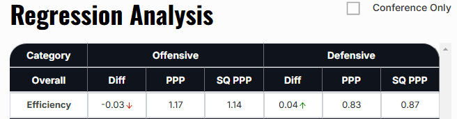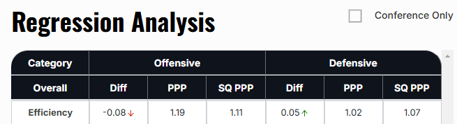 As you can see above, UCLA is due to perform a little bit worse on both ends of the court per Shot Quality. This is a bit concerning with the strength of schedule they have played so far. They are 1-1 against Top 100 KenPom teams. They lost by 8 to New Mexico on a neutral early on, and then won on a banked in buzzer beater three over Oregon last time out.
