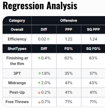 This is Florida’s ShotQuality Regression Analysis (SQ promo code: SNIPER25) on the offensive end. The scary part is that SQ actually expects them to be a tad better. I don’t think it matters who is in their way right now. I am riding with who got us here. Go Gators. (Houston would be cool too)