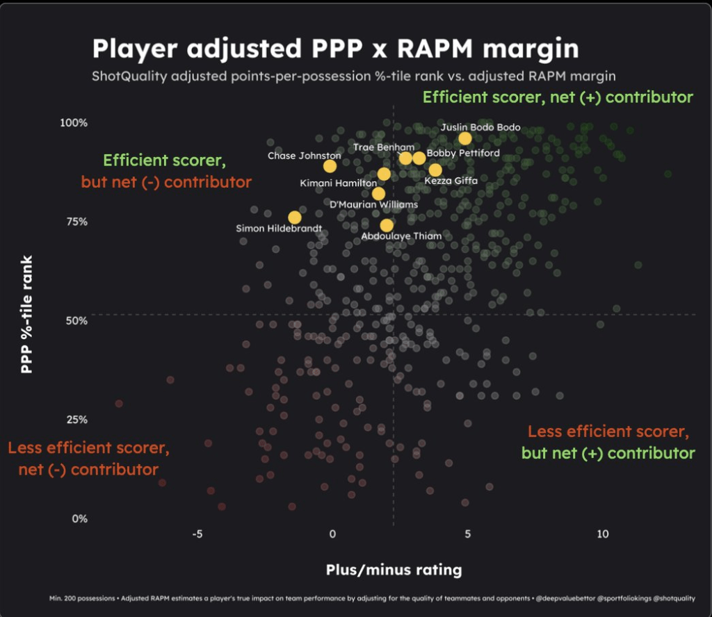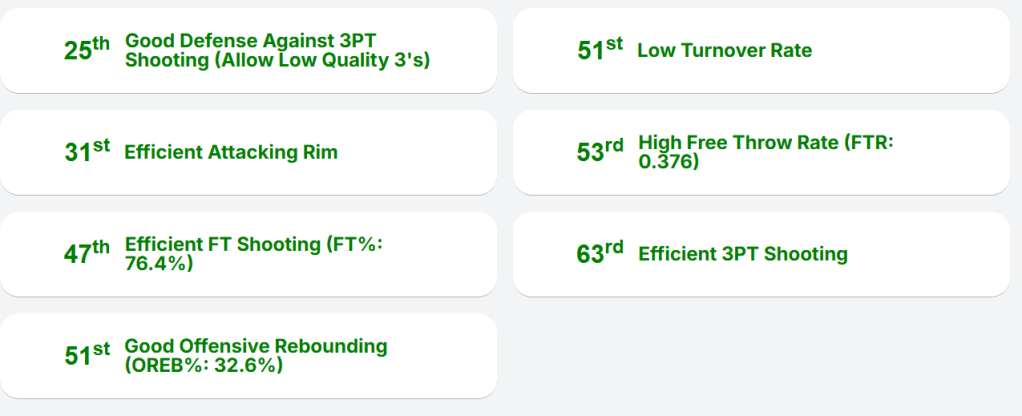 In a nutshell, the Panthers can fill it up. This bench is very deep for a team from the Big South, and it is almost impossible to find a blemish on their KenPom or ShotQuality resume’s from an offensive perspective. High Point has the 25th best offense in the KenPom adjusted efficiency rating and are 12th in effective field goal percentage. Here is also a quick ShotQuality snapshot of other areas they excel at.