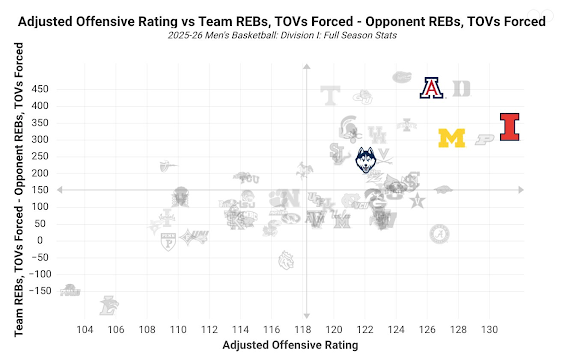 Michigan and Arizona are coming into tomorrow’s action as the #3 and #4 teams in the history of the KenPom adjusted net rating database. It dates back to 1997. Illinois also is coming in rated as the highest offensive efficiency team in the history of the database. Oh, and the fourth team is going for their 3rd title in four years. What a group!
