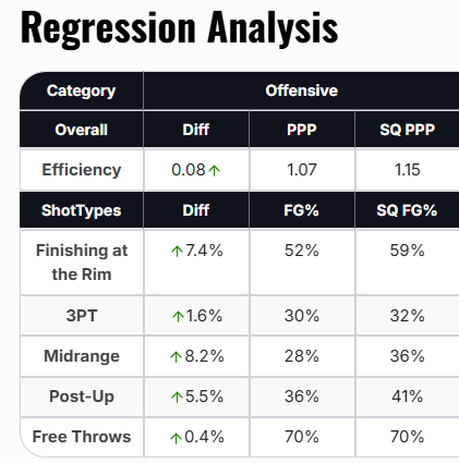 The regression analysis above shows that the Golden Eagles offense is very close to clicking. The action they are getting is fantastic. 1.15 SQ PPP is way up there for the schedule Marquette has faced. Also, SQ is showing that Seton Hall’s defense is flying well above their expected level. I think both of these units could start finding their way towards the mean in this matchup.